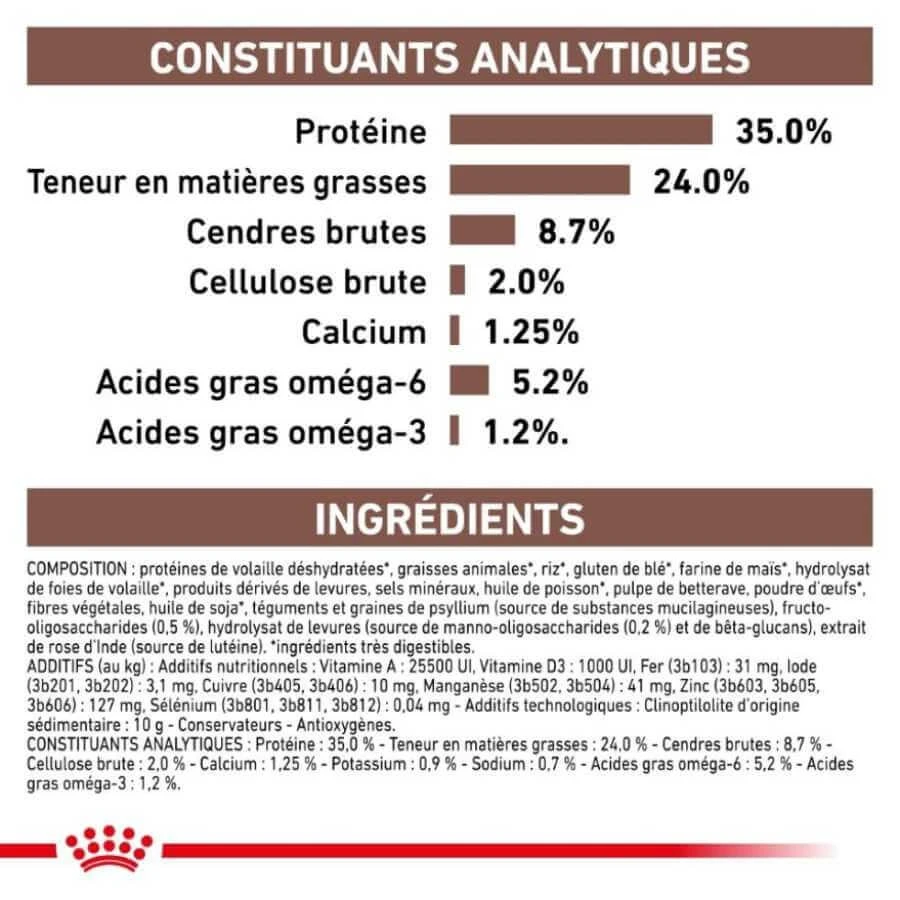 Une haute densité énergétique permet de couvrir les besoins du chat adulte tout en limitant le volume des repas et en réduisant la charge intestinale. Elle permet aussi une récupération plus rapide.